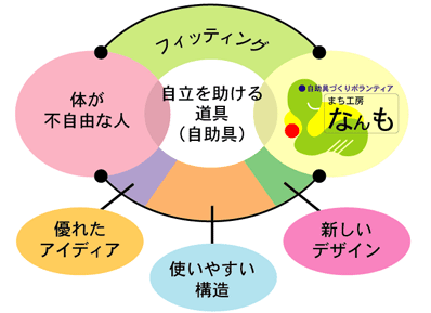 まち工房「なんも」は、日常生活に不自由を感じる方々のために、バリアフリーボランティアが、自助具の開発や住宅の改善等に関する相談に応じ、サービスを提供する活動の拠点です。
